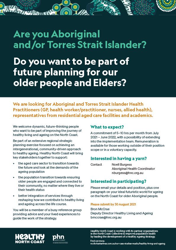 We are looking for Aboriginal and Torres Strait Islander Health Practitioners (GP, health worker/practitioner, nurses, allied health), representatives from residential aged care facilities and academics. We welcome dynamic, future-thinking people who want to be part of improving the journey of healthy living and ageing on the North Coast.